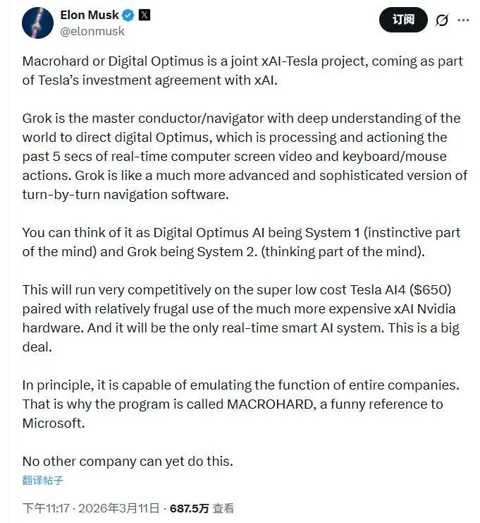 本文为Barron's原创著述。未经许可,不得转载。英文版见2026年3月12日报谈“Tesla’s ‘Macrohard’ Is More Than a Bad Pun on Microsoft. What It Means for the Stock.”(本文实质仅供参考,不组成任何方法的投资和金融提出;商场有风险,投资须严慎。)